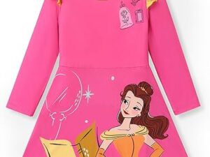 Disney Princess Frozen Elsa Minnie Mickey Stitch Ruffle Sleeve Dress A Line Long Sleeve Kids Clothes Baby to Toddler – Princess Belle Pink, 5-6 Years