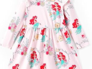 Disney Princess Frozen Elsa Minnie Mickey Stitch Ruffle Sleeve Dress A Line Long Sleeve Kids Clothes Baby to Toddler – Princess Ariel Pink, 3-4T