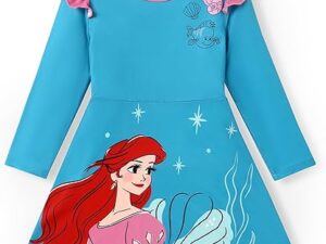 Disney Princess Frozen Elsa Minnie Mickey Stitch Ruffle Sleeve Dress A Line Long Sleeve Kids Clothes Baby to Toddler – Princess Ariel Blue, 2T