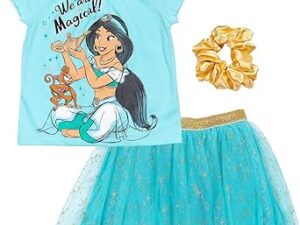 Disney Princess Moana Frozen Girls T-Shirt Tulle Mesh Skirt and Scrunchie 3 Piece Outfit Set Toddler to Big Kid – Jasmine, 6