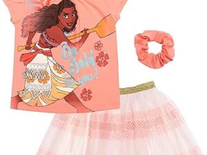 Disney Princess Moana Frozen Girls T-Shirt Tulle Mesh Skirt and Scrunchie 3 Piece Outfit Set Toddler to Big Kid – Moana, 5T