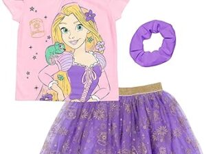 Disney Princess Moana Frozen Girls T-Shirt Tulle Mesh Skirt and Scrunchie 3 Piece Outfit Set Toddler to Big Kid – Rapunzel, 3T