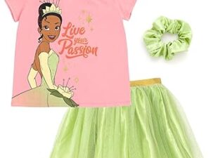 Disney Princess Moana Frozen Girls T-Shirt Tulle Mesh Skirt and Scrunchie 3 Piece Outfit Set Toddler to Big Kid – Princess Tiana, 5T