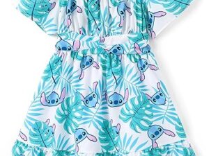 Disney Stitch Minnie Frozen Elsa Princess Girls Backless Dress Off Shoulder/Short Sleeve Cinched Waist Kids Clothes Ages 2-13 – Stitch,green, 8-9 Years