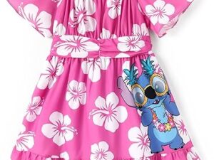 Disney Stitch Minnie Frozen Elsa Princess Girls Backless Dress Off Shoulder/Short Sleeve Cinched Waist Kids Clothes Ages 2-13 – Stitch,hot Pink, 9-10 Years