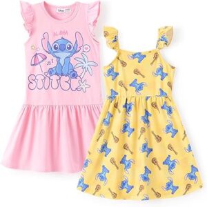 Disney Frozen Elsa Princess Minnie Mouse Stitch Toddler Girl Dresses 2 Pack Long Ruffle Sleeve Costume Set Outfit 2-13 Years – Stitch-pink, 9-10 Years