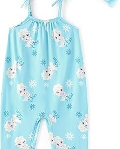 Disney Frozen Elsa Princess Minnie Stitch Marie Girls Romper with Bow Tie Strap and Headband Cute Jumpsuit for Baby & Toddler – Frozen Elsa, 3-4T