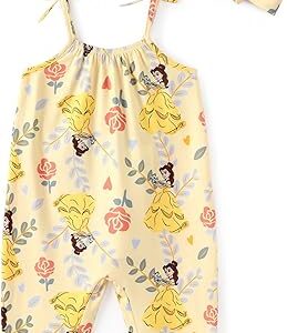 Disney Frozen Elsa Princess Minnie Stitch Marie Girls Romper with Bow Tie Strap and Headband Cute Jumpsuit for Baby & Toddler – Princess Belle, 9-12 Months