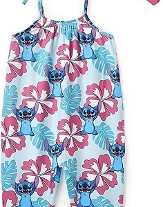 Disney Frozen Elsa Princess Minnie Stitch Marie Girls Romper with Bow Tie Strap and Headband Cute Jumpsuit for Baby & Toddler – Stitch, 4-5T
