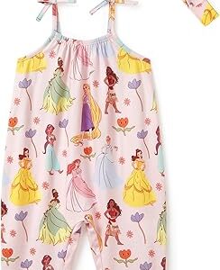Disney Frozen Elsa Princess Minnie Stitch Marie Girls Romper with Bow Tie Strap and Headband Cute Jumpsuit for Baby & Toddler – Princess, 4-5T