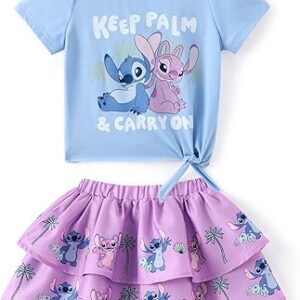 Disney Frozen Elsa Stitch Minnie Princess Toddler Girls’ T-Shirt & Double Ruffle Skirt 2 Piece Outfit Summer Clothes Set 2-9Y – Stitch-blue, 5-6 Years