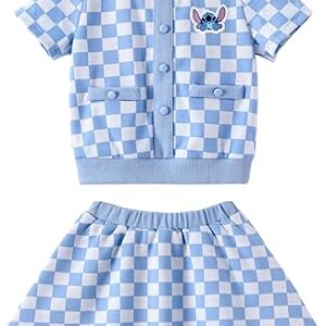Disney Frozen Elsa Stitch Princess Moana Minnie Toddler Girl 2 Piece Outfit Kid Pearl Button Knit Top & Tweed Skirt Set 2-13Y – Stitch-blue, 8-9 Years