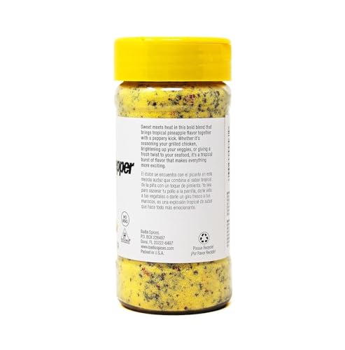 A unique blend that captures the sweet essence of sweet pineapple combined with a spicy pepper kick. Perfect for sprinkling over grilled chicken, seafood, or tropical salads. Do not settle for boring or bland food anymore! Treat yourself to Badia’s love and magic. The Pineapple Pepper is a plethora of flavors that turns all meals into a work art. Incredible on ALL seafood, slices Tomatoes, fruit, any chicken dish, rice, dressing, sauces and turns vegetables into bright flavor dished.