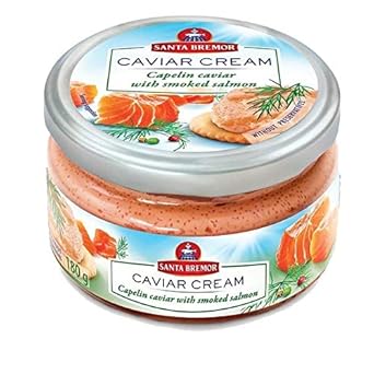 by Santa Bremor. Product of Belarus. Spreadable Capelin Caviar cream with smoked salmon. It can be served as a dip with vegetables or as a spread on a toast. Ingredients: capelin roe salted (42%), sunflower oil, water, smoked salmon pieces, sugar, egg yolk powder, natural food colors: capmine, paprika extract, modified potato starch, thickener xanthan gum, skimmed milk powder, acidity regulator: acetic acid. Glass Jar 6.35 oz (180 gr).