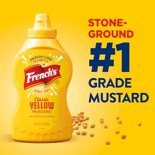 Crafted by master grinders, French’s Classic Yellow Mustard is America’s best-loved mustard. Made from stone ground mustard seeds with a smooth texture and tangy taste, this zero fat, zero calorie mustard brings hot dogs, burgers, and sandwiches to life. Make room at the table for French’s Classic Yellow Mustard. With no artificial flavors or artificial coloring in a conveniently sized 14 oz. bottle, enjoying mustard flavor at picnics, tailgate parties, baseball games and barbecues is easy with French’s mustard. The perfect complement to hot dogs, sandwiches, marinades, dressings, eggs, and even as a mustard dipping sauce, French’s Classic Yellow Mustard has been held to the same high standards for the last 100 years—authentic American flavors that make food taste great.