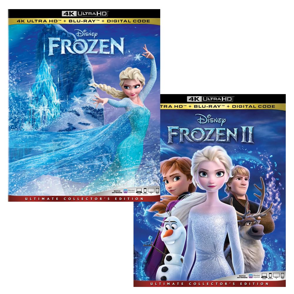 Bring home the magic of Arendelle with this Frozen + Frozen II 4K Bundle, featuring both beloved Disney animated films in breathtaking 4K Ultra HD.Follow Elsa, Anna, Olaf, and friends on two unforgettable journeys filled with music, adventure, heart, and breathtaking animation — now remastered for the ultimate viewing experience.Perfect for family movie nights, collectors, or as a gift for any Disney fan, this 2-movie set lets you relive the wonder all over again — now in dazzling 4K clarity with HDR.📀 Included Films (4K UHD + Blu-ray):Frozen (2013) – The Academy Award-winning classic that started it allFrozen II (2019) – A deeper, emotional journey “into the unknown”Why You’ll Love It:Both films in 4K Ultra HD with HDR for brilliant color and detailIncludes Blu-ray editions for standard HD viewing and bonus featuresStunning animation, memorable music, and powerful themes of love, courage, and sisterhoodA perfect addition to any Disney or animated film collection