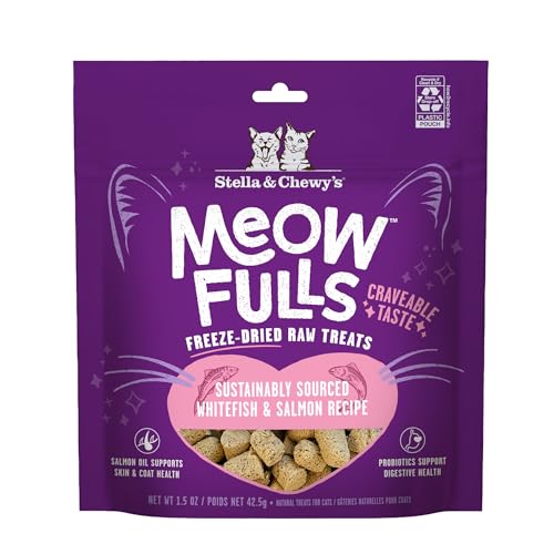 Stella & Chewy’s Meowfulls Freeze Dried Cat Treats – Whitefish & Salmon Recipe – Raw Protein with Probiotics & Salmon Oil – 1 Calorie Per Treat – 1.5 oz